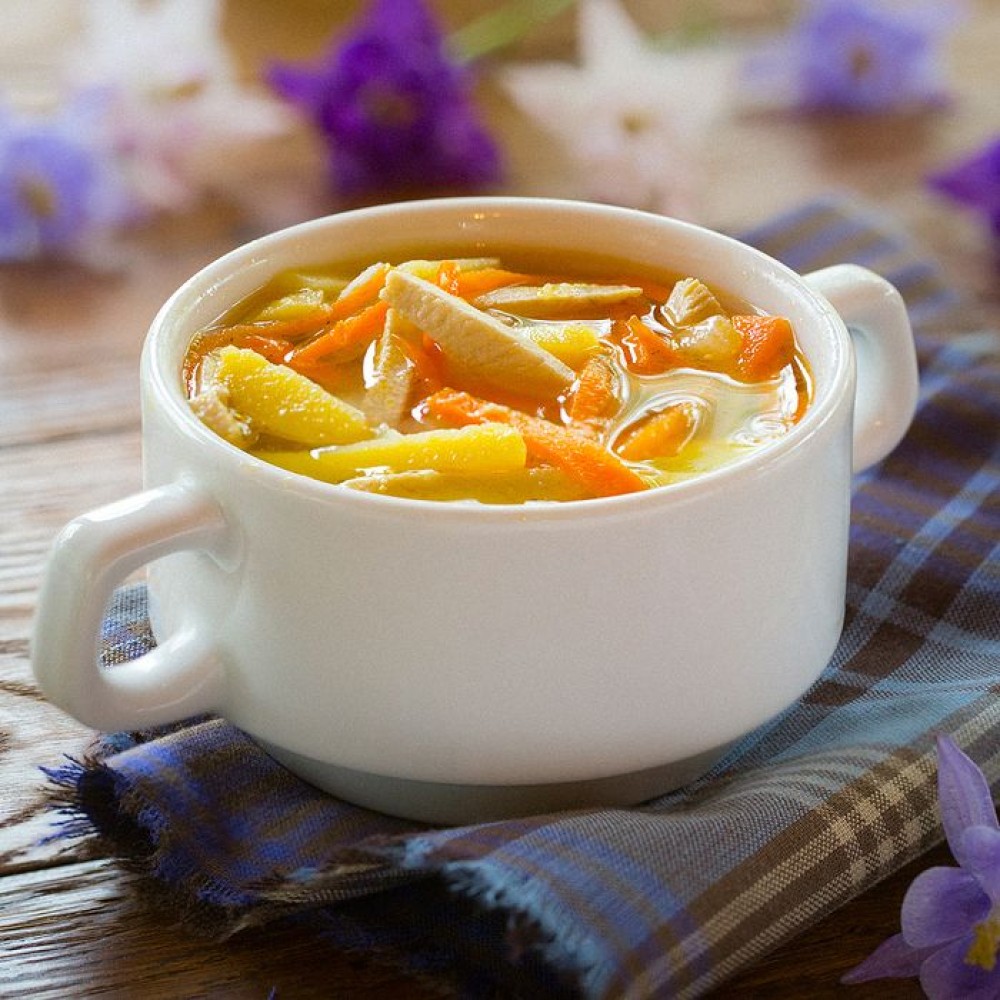 Куриный бульон с лапшой, кусочками курицы и овощами. Подается с зеленью и хрустящими гренками. 200/20г