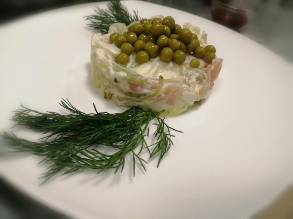 Салат с нежной семгой,слабого посола,отварными овощами, яйцом, консервированным горошком, маринованными огурчиками и майонезом, украшается зелёным луком. 250г