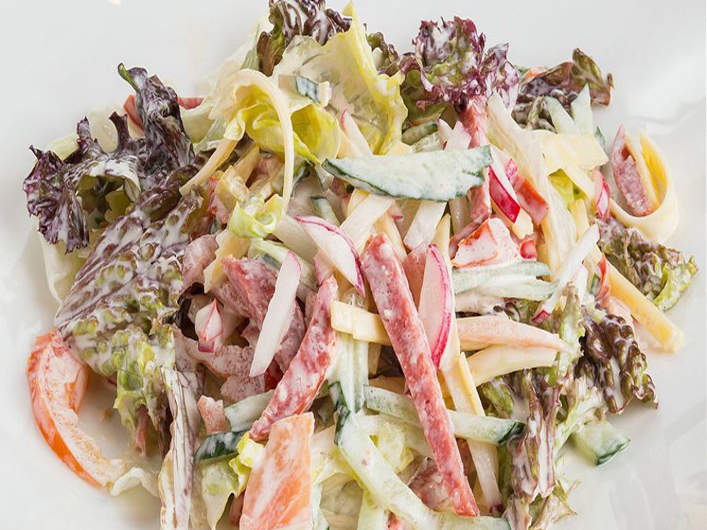 Салат "Айсберг", свежие помидоры,огурец и редис в сочетании с твердым сыром и сервелатом, заправленный соусом "1000 островов". 185г