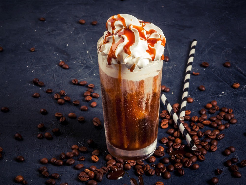 Эспрессо,сливочное печенье,молоко,клубничный топпинг,ванильное мороженное и взбитые сливки