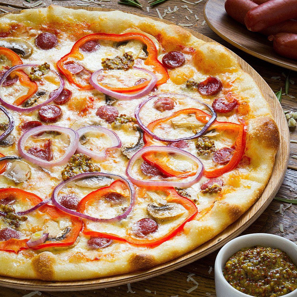 Фирменный сливочный и томатный соус,баварские сосиски,шампиньоны,сладкий перец,сыр,сладкий лук.