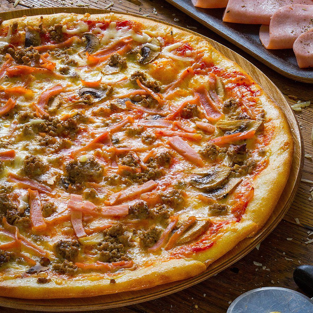 Фирменный сливочный и томатный соус,сыр,шампиньоны,ветчина,фарш говяжий