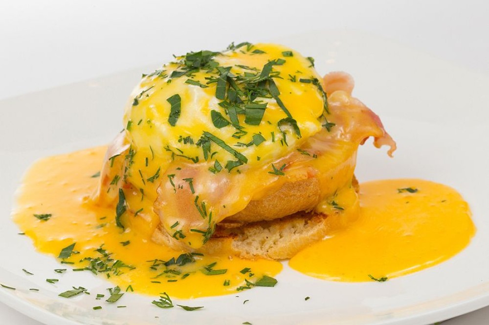 Традиционное французское блюдо из яиц, на воздушной булочке с ломтиками обжаренного бекона и голландским соусом. Украшается зелёным луком.