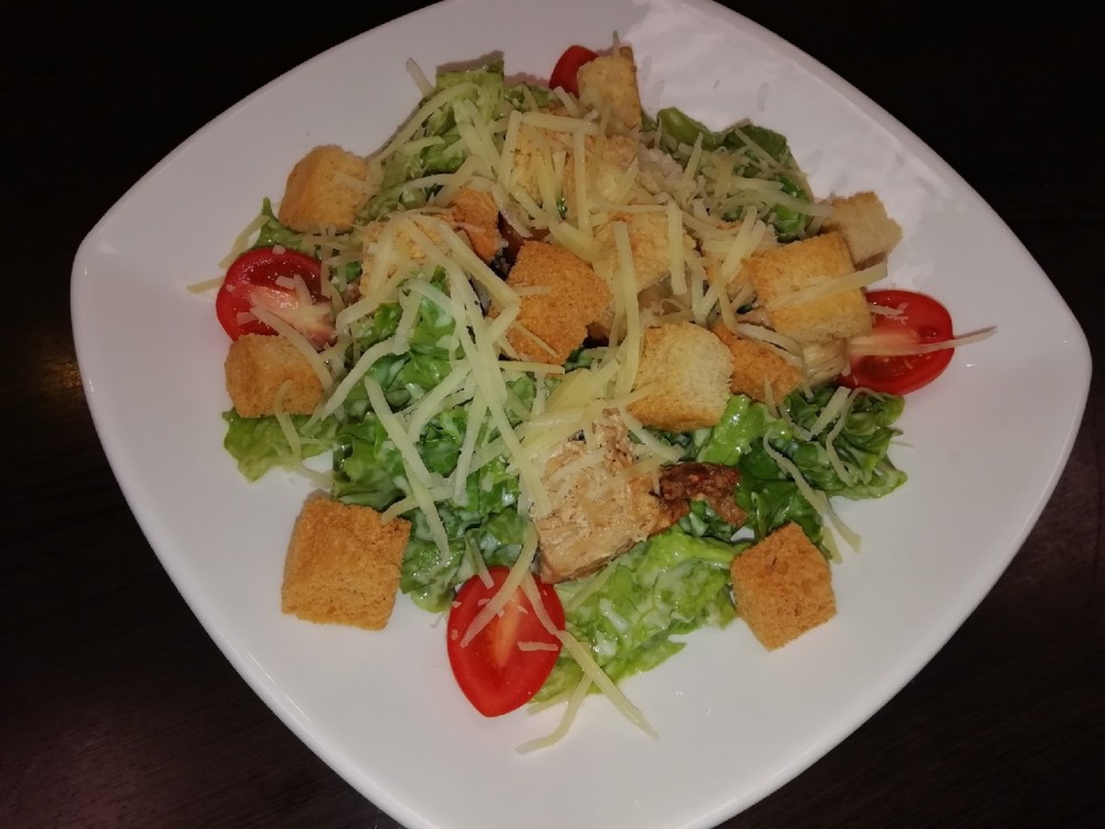 Листья салата, заправленные, классическим соусом "Цезарь", с помидорами, гренками, сыром "Пармезан" и куриным филе.210г.