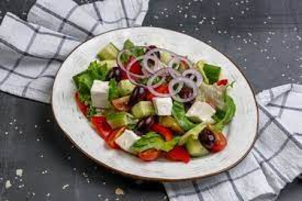 Листья салата Айсберг, помидоры "Черри", свежий огурец, болгарский перец, Красный репчатый лук, классический сыр "Фета", маслины,заправленные маслом "Микс". 220г.