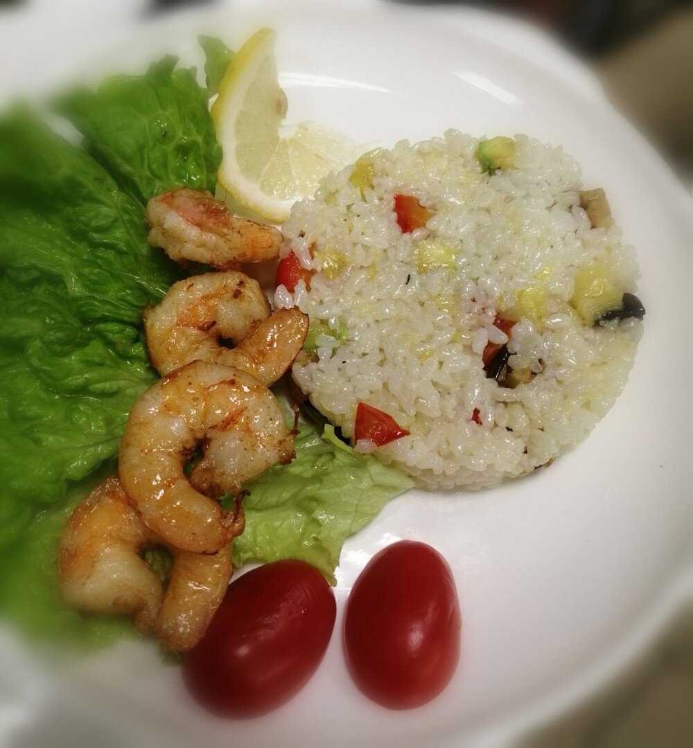 Тигровые креветки с рисом и овощами.